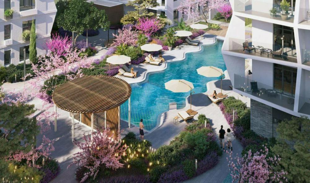 Оформление с использованием миндальных деревьев, создающих особую атмосферу весной во время цветения. Архитектурные решения подчеркивают изящество и легкость.